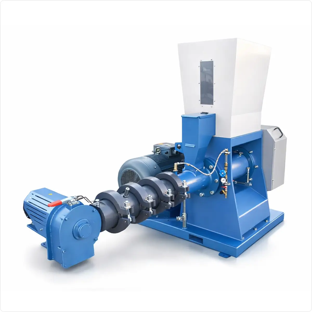 Extruderul E-1000 produce 1000 kg/oră de furaje de înaltă calitate. Prin autoîncălzire la 120–140°C, acesta sterilizează cerealele și soia, îmbunătățind digestibilitatea, reducând consumul de energie cu 30% și economisind peste 40% din cereale.