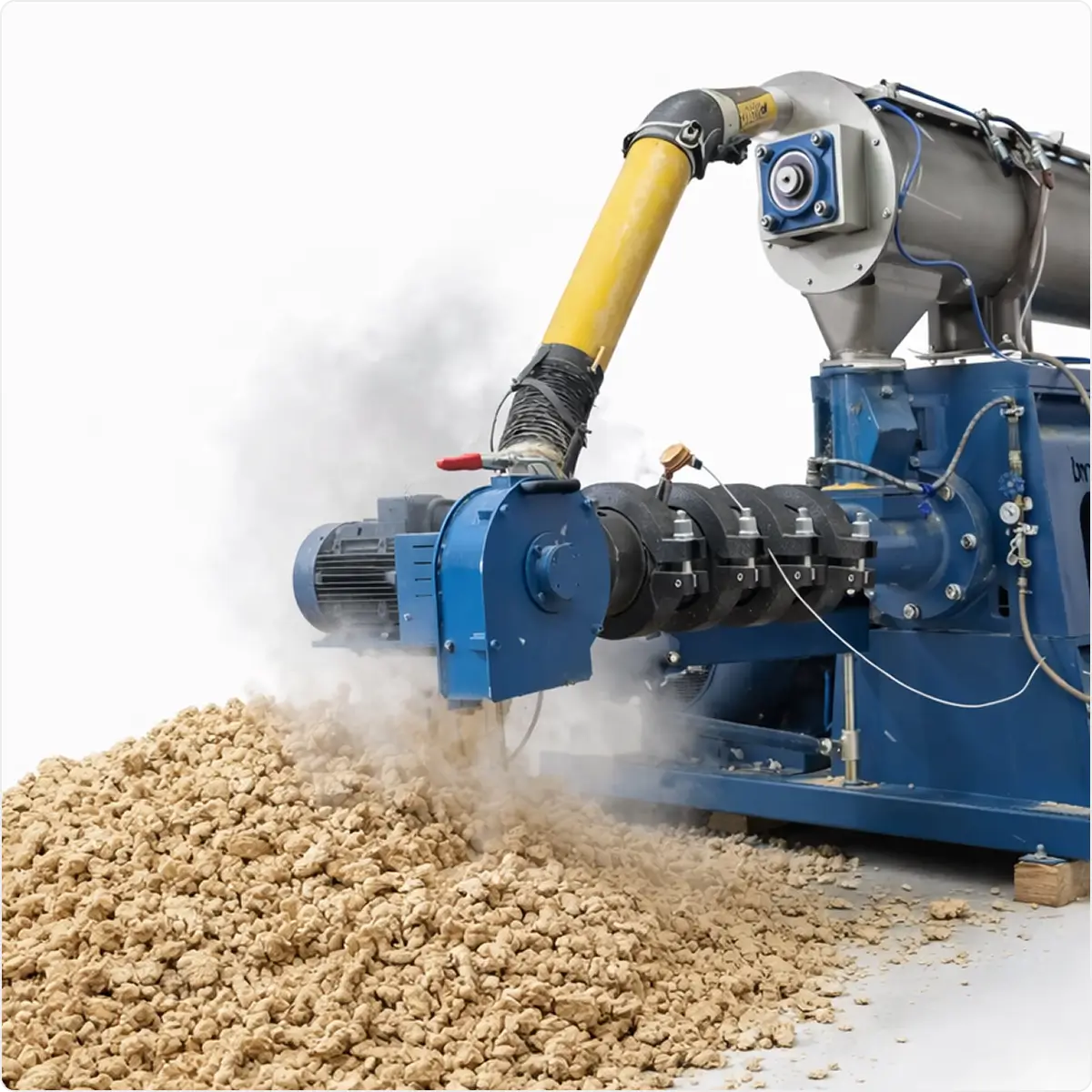 Extruderul E-1500 produce până la 1000 kg/oră de peleți furajeri și proteine vegetale texturate (TVP). Tehnologia sa îmbunătățește calitatea proteinelor și elimină microorganismele dăunătoare pentru diverse specii de animale, păsări și pești.