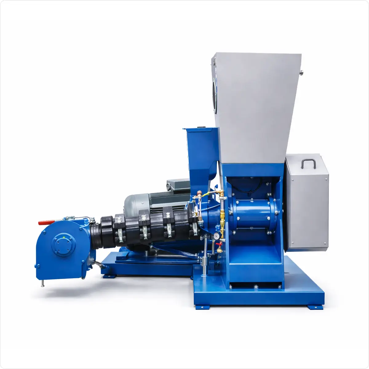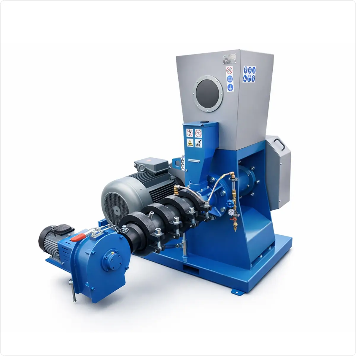 Extruderul E-500 produce 500 kg/oră de furaje de înaltă calitate. Prin tratament termic, acesta sterilizează soia și cerealele, sporind digestibilitatea și reducând consumul de energie cu peste 30%.